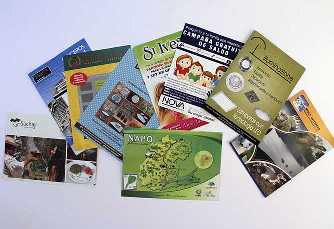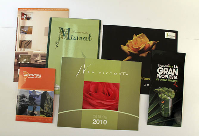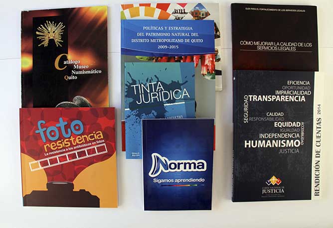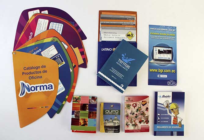 Memorias institucionales, libros, revistas, cuadernos institucionales, informes de rendición de cuentas, catálogos, dípticos, trípticos, hojas volantes, afiches, revistas, folletos, brochures, postales, calendarios, invitaciones, cajas, porta boletos, individuales de mesa, etiquetas, fundas, hojas membretadas, tarjetas de presentación, sobres, carpetas.